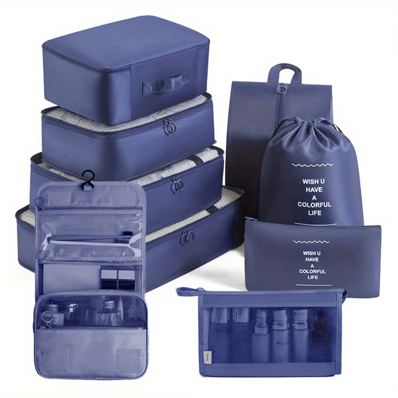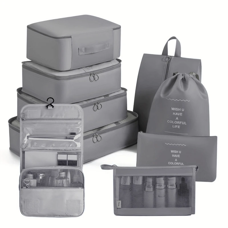 🌟 What is it - Meet the ultimate travel companion! Our 9-piece Travel Organizer Storage Bag Set features packing cubes, shoe pouches, and a makeup bag designed to keep your luggage tidy and efficient while on-the-go.