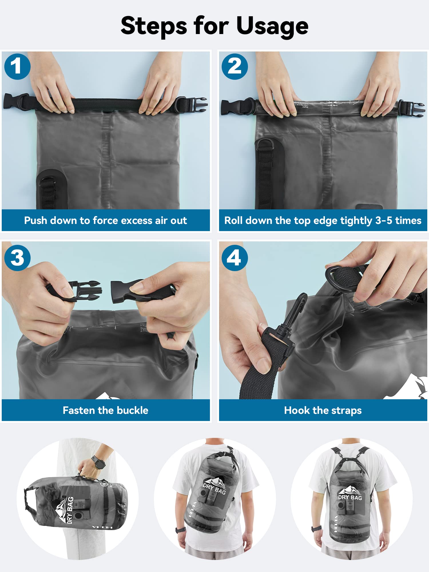 - Durable - Made with wear-resistant PVC material: 0.6 mm thick at the bottom and 0.3 mm on the sides, this waterproof bag is easy to wipe clean and suitable for all kinds of weather and environment. Comfortable to carry during long outdoor activities