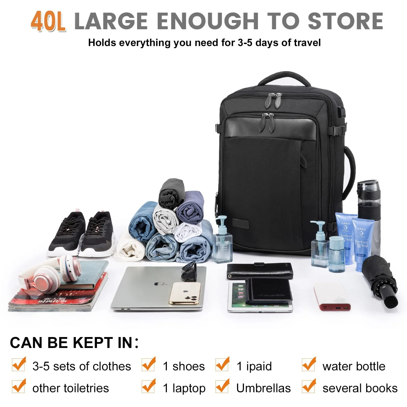 🛫 How to use it - Simply pack your clothes in the packing cubes for organized travel. Adjust the expandable feature based on your needs. Use the padded straps for day trips or carry it with the top handle when not on your back.