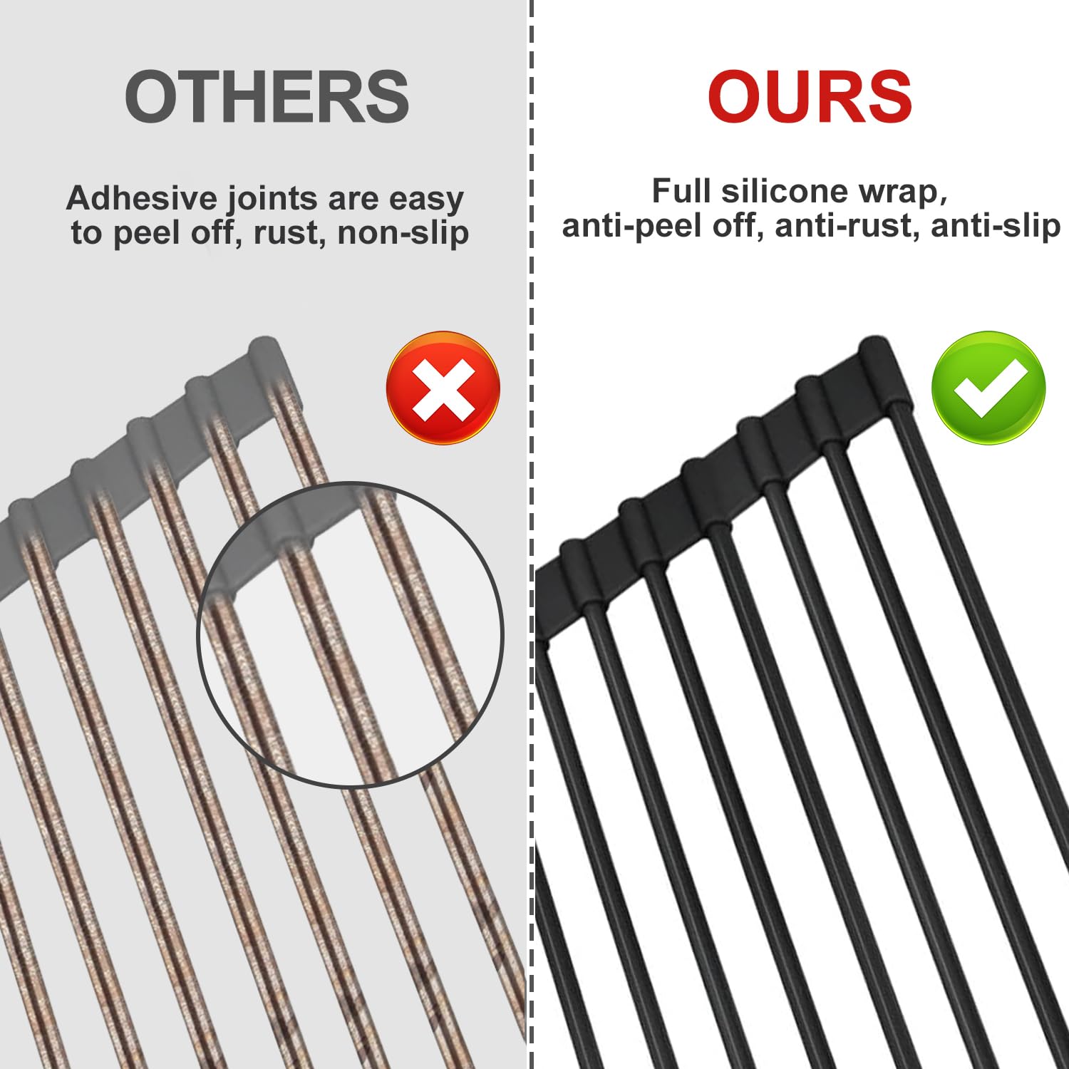 - Upgraded Non-slip & Heat Resistant Full FDA Food Grade Silicone Wrapped Dish Drying Rack: Much sturdier than the stainless steel sink drying rack and will never slide around like a metal one without a coating! The silicone roll up dish drying rack is BPA Free for safe use on fruits, veggies, cake, etc. So the dish racks for kitchen counter can be also used as a trivet to place things that take directly out of the oven! Heat resistant 400°F (204°C) so use it to protect countertops from hot pans.