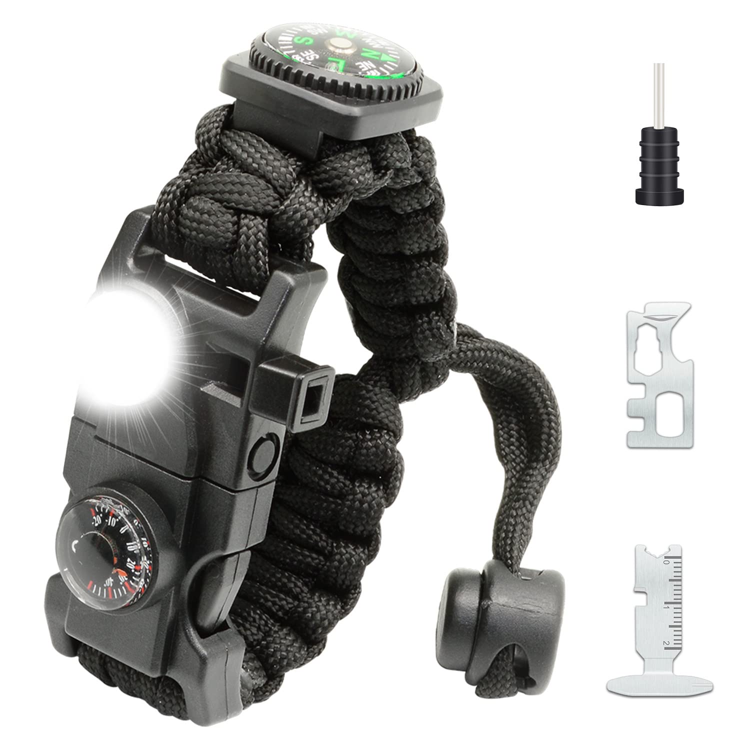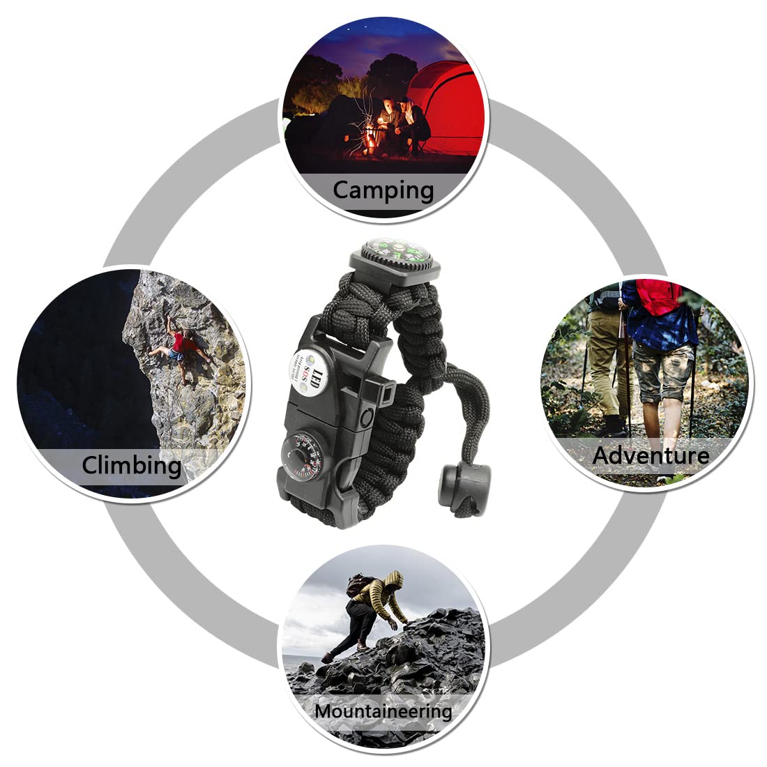 - 【20 in 1 Survival Bracelet】: it includes more survival tools: Upgrade compass, SOS led light, flint fire starter, whistle, Thermometer, wear this while traveling, it is not only a decor, but also a survival gear kit