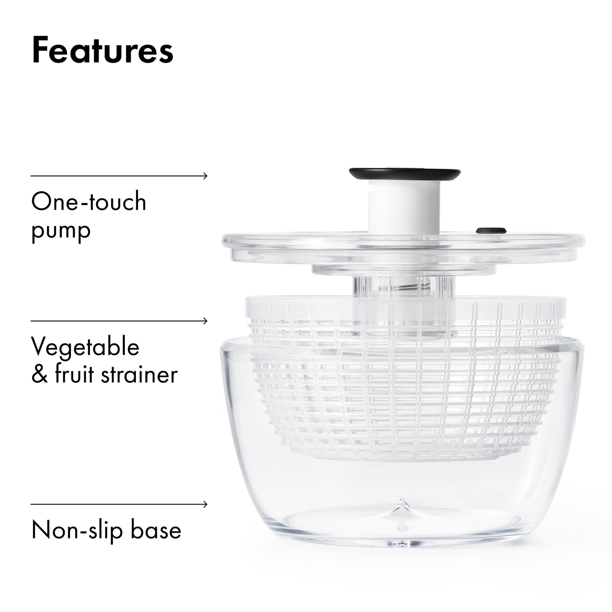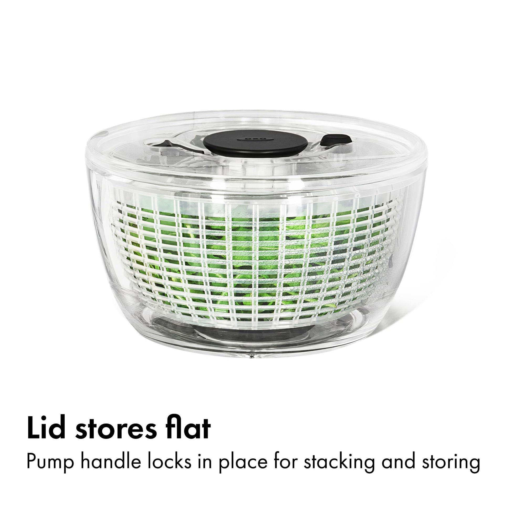 Details: A new take on our classic Salad Spinner -- in a compact, convenient size. Did you know that OXO invented the one-touch salad spinner? It's one-handed pump gives you maximum lettuce-drying with minimum effort. Dry greens with a simple press of the soft, nonslip knob. The nonslip base keeps the bowl steady on the countertop, and the updated built-in brake button stops the salad spinner for unloading. The basket doubles as a colander, and the lid comes apart for easy cleaning. From the one-touch press-to-pump to the patented brake to the non-skid base, this salad spinner is designed to function seamlessly in your kitchen. The salad spinner stores neatly after use - just press the pump handle down, then slide the storage lock into place. This holds the pump flush with the lid for stacking and storing. Plus it's a multi-tasker that's not just for lettuce: The OXO salad spinner doubles as a vegetable and fruit strainer, and makes a great serving bowl too. Use it as a lettuce keeper during meal prep, toss your salads directly in the bowl, and serve. The lid comes apart on this salad spinner, so moisture won't accumulate and it's easy to clean. All parts are dishwasher safe - top rack is recommended. This is the large salad spinner - roomy enough to hold two heads of Romaine lettuce or a full bag of broccoli or string beans.