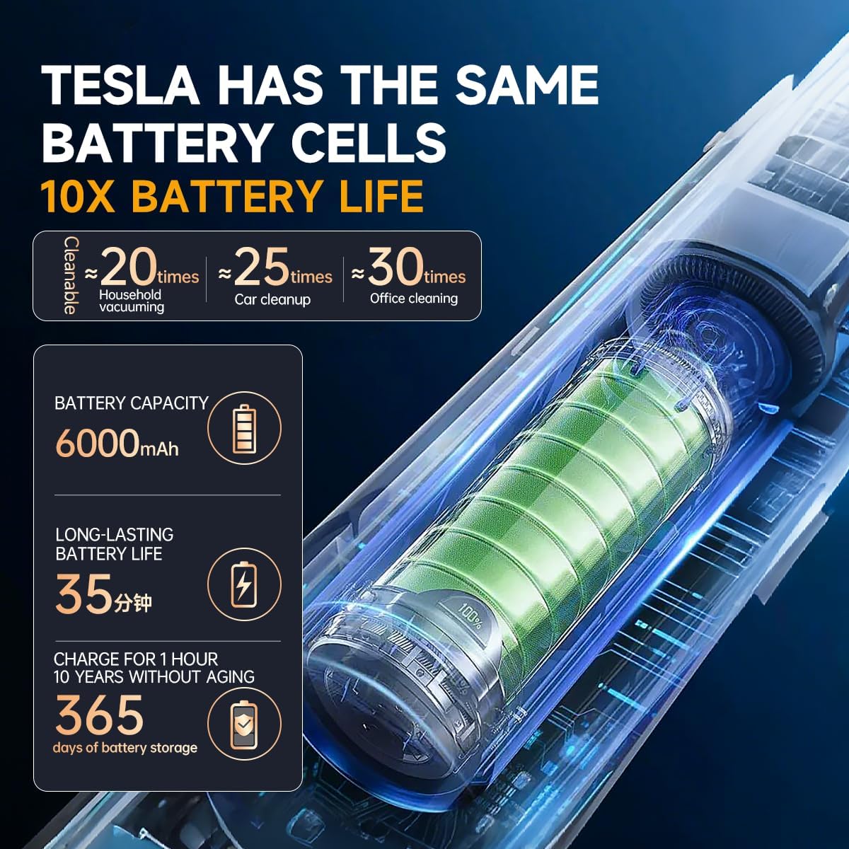 - Long Runtime:this portable car vacuum offers Long Runtime life. With a 6000mAh battery capacity, it provides up to 35 minutes of long - lasting runtime, capable of ~20 household vacuumings, ~25 car cleanups, or ~30 office cleanings. Charges in 1 hour and has 365 days of battery storage without aging